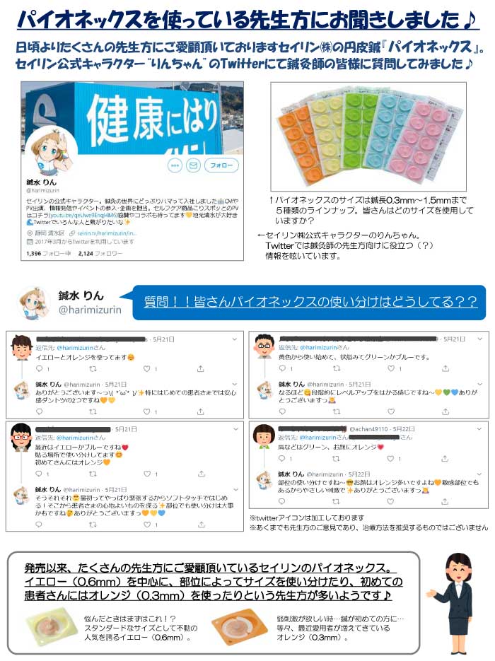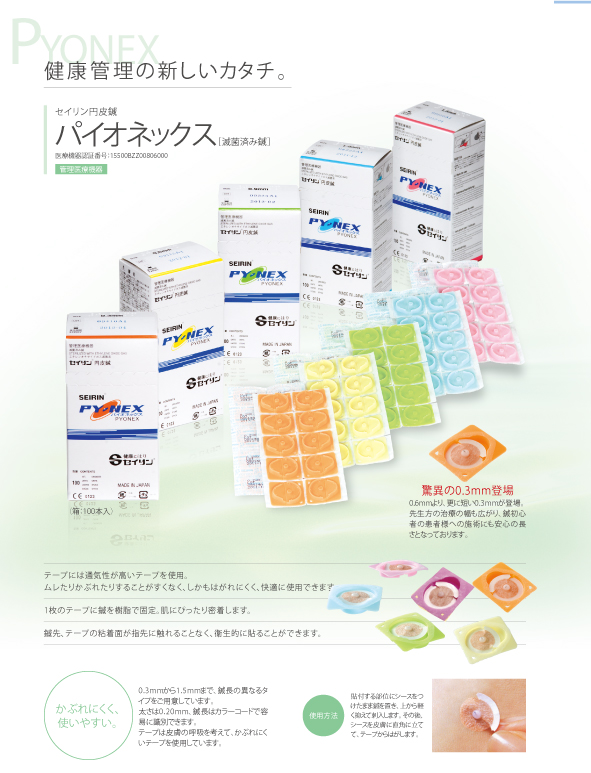 セイリン円皮鍼 パイオネックス 100本入 商品番号:02118005-s 入数:100本 メーカー/販売代理店:セイリン 出荷予定:即日 許可分類:管理医療機器クラス2 特管 許可番号:15500BZZ00806000 参考価格¥2,530(税込) 売価:¥1,870(税込) (税別¥1,700) :0% :カタログ有り :サンプル有り ■ 有資格者選択してくださいはい 「有資格者」とは、鍼灸師、医師のことです タイプ鍼長0.3mm鍼長0.6mm鍼長0.9mm鍼長1.2mm鍼長1.5mm鍼長1.7mm鍼長0.3mmゼロ線径0.11mm01234567891011121314151617181920212223242526272829303132333435363738394041424344454647484950線径0.15mm01234567891011121314151617181920212223242526272829303132333435363738394041424344454647484950線径0.17mm01234567891011121314151617181920212223242526272829303132333435363738394041424344454647484950線径0.2mm01234567891011121314151617181920212223242526272829303132333435363738394041424344454647484950012345678910111213141516171819202122232425262728293031323334353637383940414243444546474849500123456789101112131415161718192021222324252627282930313233343536373839404142434445464748495001234567891011121314151617181920212223242526272829303132333435363738394041424344454647484950線径0.2mmテープ 直径9mm01234567891011121314151617181920212223242526272829303132333435363738394041424344454647484950商品詳細説明かぶれにくく、使いやすい 鍼の長さが5種類あり、貼付部位や使用感によって使い分けができます。 鍼を樹脂で固定する独自の設計を採用しています。 個別包装を行い開封まで無菌維持がされており、さらに取り出す際に指がテープの粘着面に触れることがありません。 気性の良いテープを使用しています。 ※医療用テープとして一般的に広く使用されているテープですが、使用感には個人差がありますので使用上の注意を順守してください。 オレンジ イエロー グリーン ブルー ピンク ラベンダー バイオレット(ゼロ) テープ直径9mm 0.3mm 0.6mm 0.9mm 1.2mm 1.5mm 1.7mm 0.3mm 0.11mm 0.15mm 0.17mm 0.20mm 0.20mm 0.20mm 0.20mm 容量 100本 サイズ テープ径/12mm 素材 鍼体/ステンレス鋼 クラスⅡ/管理 医療機器認証番号:15500BZZ00806000 PY-Zero/PY-Zero9mm(旧 パイオネックス・ゼロ/テープ径9mm) 皮膚に刺入しないステンレスの接触タイプ 皮膚に刺入しないので、押圧による刺激となります。 鍼先が尖っていないため、皮膚に刺入しません。 鍼を樹脂で固定する独自の設計を採用しています。 個別包装を行い開封まで無菌維持がされており、取り出す際に指がテープの粘着面に触れることがないよう、独自の工夫を施しました。 通気性の良いテープを使用しています。 ※医療用テープとして一般的に広く使用されているテープですが、使用感には個人差がありますので使用上の注意を順守してください。 シール紙のカラーが、テープ径12mmはバイオレット、テープ径9mmはオレンジです。 カラーコード バイオレット 鍼長(mm) 0.3 線径(mm) 0.20 この商品を見た人は、このような商品も購入しています マグレインチタンビーズ クリア 2000粒入 商品コード:03078003 定価:15,400円(税込)売価:12,980円(税込) 詳細を見る マグレインクリア 金 240粒入 商品コード:03055003 定価:2,090円(税込)売価:1,672円(税込) 詳細を見る マグレインチタンビーズ クリア 200粒入 商品コード:03078002 定価:2,200円(税込)売価:1,584円(税込) 詳細を見る マグレインクリア 金 2400粒入 商品コード:03055004 定価:17,600円(税込)売価:14,107円(税込) 詳細を見る ファロス円皮鍼 100本入 商品コード:02209001-s 定価:1,067円(税込)まとめ買い価格売価:869円(税込) 詳細を見る