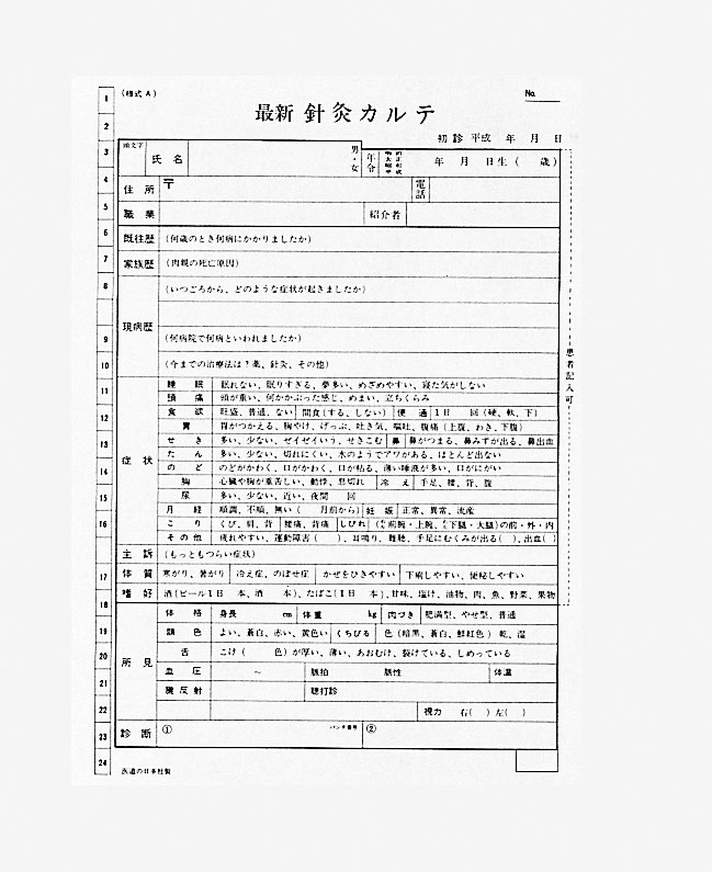 最新針灸カルテ 商品番号:12021001 入数:100枚 メーカー/販売代理店:医道の日本社 出荷予定:3~5日後 許可分類: 許可番号: 参考価格¥825(税込) 売価:¥825(税込) (税別¥750) まとめ買い価格 10個以上で1個あたり¥799円(税込)(税別¥727円) :1% タイプA401234567891011121314151617181920212223242526272829303132333435363738394041424344454647484950B501234567891011121314151617181920212223242526272829303132333435363738394041424344454647484950商品詳細説明記載項目 既往歴 家族歴(肉親の死亡原因) 現病歴 症状 主訴 体質 嗜好 所見 診断 脈 人体図を用いた記載(圧痛、刺鍼ポイントなど) 100枚1組 この商品を見た人は、このような商品も購入しています ガラスカッピング 吸着具8号G 商品コード:08008031 定価:8,360円(税込)まとめ買い価格売価:7,942円(税込) 詳細を見る CIANA シリコーンカッピング M (4個入) 商品コード:08007202 定価:5,940円(税込)売価:5,049円(税込) 詳細を見る ソルボ D-横軸アーチパッド M(10個入) 商品コード:06073056 定価:1,540円(税込)売価:1,474円(税込) 詳細を見る