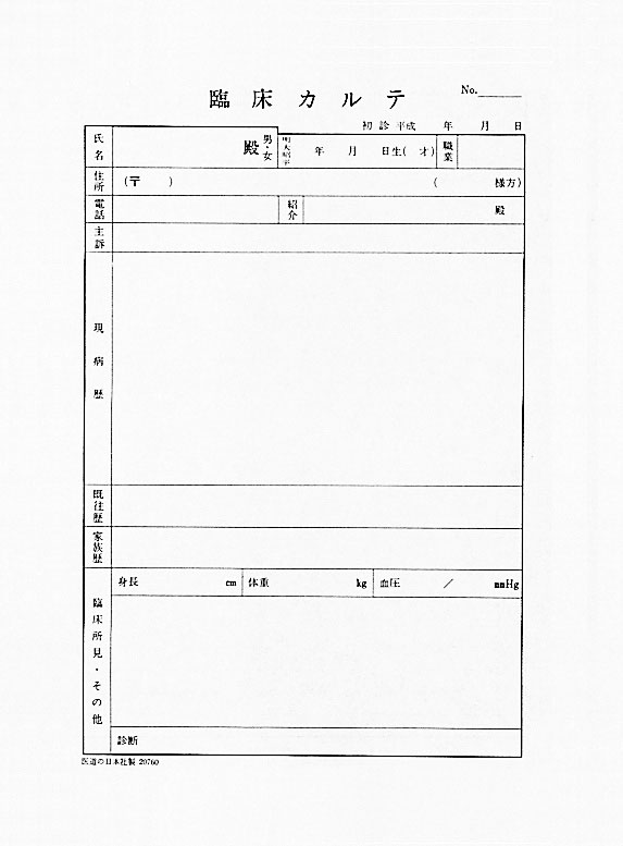 臨床カルテ(B5・A4) 商品番号:12024001 入数:100枚 メーカー/販売代理店:医道の日本社 出荷予定:3~5日後 許可分類: 許可番号: 参考価格¥825(税込) 売価:¥825(税込) (税別¥750) まとめ買い価格 10個以上で1個あたり¥799円(税込)(税別¥727円) :1% タイプA401234567891011121314151617181920212223242526272829303132333435363738394041424344454647484950B501234567891011121314151617181920212223242526272829303132333435363738394041424344454647484950商品詳細説明臨床用カルテ 記載項目 現病歴 既往症 家族歴 臨床所見・その他 診断 身長、体重、血圧 経過、処置、その他 100枚1組 この商品を見た人は、このような商品も購入しています ガラスカッピング 吸着具8号G 商品コード:08008031 定価:8,360円(税込)まとめ買い価格売価:7,942円(税込) 詳細を見る CIANA シリコーンカッピング M (4個入) 商品コード:08007202 定価:5,940円(税込)売価:5,049円(税込) 詳細を見る ソルボ D-横軸アーチパッド M(10個入) 商品コード:06073056 定価:1,540円(税込)売価:1,474円(税込) 詳細を見る