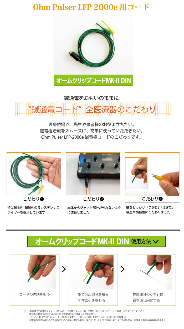 オームクリップコードMKⅡ DIN(1本)【LFP-2000e用】 商品番号:08101082 入数:1本 メーカー/販売代理店:全医療器 出荷予定:即日 許可分類: 許可番号: オープン価格 売価:¥2,475 (税別¥2,250) :23ポイント 数量: 本 商品詳細説明Ohm Pulser LFP-2000e専用『鍼専用コード』 コード先端に指をかけて、中から金属部分を出した状態で、金属先端の輪に鍼を通し使用する。鍼体をしっかり掴むので鍼がずれにくい構造で、コード先端部分の軽量クリップで負担を和らげる。 ※色のご指定できません YouTube動画 オームパルサーLFP-2000e 基本操作編 YouTube動画 オームクリップコードMK-Ⅱ 使い方 ①コードの先端(プラスチック部分)を持つ ②人差し指と中指の間に先端を挟み 親指で付け根の部分を固定する ③人差し指と中指を、親指の方へ引き寄せる ④先端からかぎ針状のものが出てくるので それに鍼を引っ掛ける ⑤指を離すと、ピタッと鍼が固定される コード先端が軽量の鍼専用のクリップコードです。 みのむしコードだけでなく、ご使用状況によって使い分けるなどして 是非ご利用ください。 この商品を見た人は、このような商品も購入しています Kii EMS Pad Mサイズ(粘着パッド) 商品コード:08112303 定価:1,760円(税込)売価:836円(税込) 詳細を見る 3M レッドダット心電図検査用電極 2360(導電性粘着剤つき) 商品コード:08108011 オープン価格売価:1,188円(税込) 詳細を見る Kii EMS Pad Lサイズ(粘着パッド) 商品コード:08112304 定価:1,980円(税込)売価:1,078円(税込) 詳細を見る スリーエイトPAD S(4枚入) 商品コード:08101008 定価:1,100円(税込)売価:990円(税込) 詳細を見る プラカップRP 6号 商品コード:08005163 定価:1,540円(税込)まとめ買い価格売価:1,316円(税込) 詳細を見る