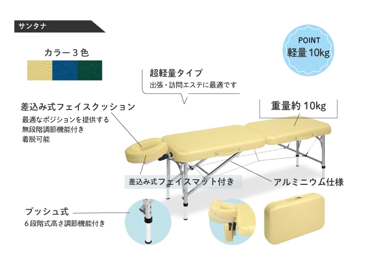 ポータブルベッド サンタナ 返品不可 商品番号:09013095 入数:1台 メーカー/販売代理店:タカダベッド 出荷予定:商品入荷後 許可分類: 許可番号: 参考価格 ¥110,330(税込) 売価:¥69,300 (税別¥63,000) :0ポイント 色選択 選択してください アイボリー メディブルー メディグリーン 数量: 台 商品詳細説明約10kg台を実現した軽量アルミニウム仕様 差込式フェイスマット付き。楽に持ち運びができるコンパクト設計 操作性と安全性を優先したプッシュ式6段階式高さ調節機能付き クッション厚6㎝ 国産高品質レザーを使用 クッション厚 6㎝ 重量 約10kg ベッド幅 52cm ベッド長さ 170cm(差込式フェイスマットの長さ30センチは含まれておりません) ベッド高さ 52/67cm(6段階調節) 組立の有無 組立済み 強度レベル (メーカー指標 5段階) オリジナルレザー( ビニルレザー ) 3 色からお選びいただけます。 メーカより直送のため「代引」「ヤマト運輸指定」不可 関連商品 ポータブルベッド専用 キャスター付きキャリーバッグ この商品を見た人は、このような商品も購入しています 富士商 ホット&スチームパッド 首・肩用 商品コード:06229307 定価:4,950円(税込)まとめ買い価格売価:2,821円(税込) 詳細を見る 綿花 4cm×4cm 500g 商品コード:06030002 定価:1,650円(税込)売価:1,045円(税込) 詳細を見る ディスポカバーTP 500枚 商品コード:09030101 オープン価格売価:3,355円(税込) 詳細を見る テイコクファルマ ファルマテックス緑 商品コード:06289020 オープン価格まとめ買い価格売価:2,365円(税込) 詳細を見る さらさテープ 商品コード:06272001 定価:2,486円(税込)まとめ買い価格売価:1,930円(税込) 詳細を見る