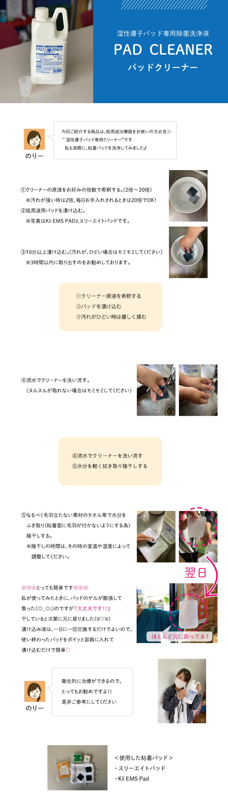 湿性導子パッド除菌洗浄液 パッドクリーナー 返品不可 商品番号:10004028 入数:2L メーカー/販売代理店: 出荷予定:3~5日後 許可分類: 許可番号: 参考価格 ¥4,510(税込) 売価:¥4,059 (税別¥3,690) まとめ買い価格 6個以上で1個あたり¥3,653円(税込)(税別¥3,321円) :37ポイント 数量: 個 商品詳細説明低周波治療器・中周波治療器・パッドクリーナー・除菌剤 従来より低周波治療器用導子パッドに対して汚染が問題になっており、汚れ、雑菌などが付着して院内感染の原因につながります。 優れた洗浄力を持つ界面活性剤にトリクロサン(インガサンDP300)を配合し、除菌効果をプラスしました。 タンパク・脂肪・汚れなどを洗浄します。 2倍希釈で使用 パッド用 Kii EMS Pad M (粘着パッド) Kii EMS Pad L (粘着パッド) スリーエイトPAD S(4枚入)(LFP-4000A・4500・4800・5000・7000) スリーエイトPAD L(4枚入)(LFP-4000A・4500・4800・5000・7000) この商品を見た人は、このような商品も購入しています 外皮消毒剤 エスクリンα (アルファ) ONE 200包入 商品コード:06030101 定価:1,603円(税込)売価:1,287円(税込) 詳細を見る 外皮消毒剤 消エタ・バリュー 500ml 商品コード:10011203 オープン価格まとめ買い価格売価:464円(税込) 詳細を見る アルコール綿K(100枚個包装) 商品コード:06030105 定価:440円(税込)売価:385円(税込) 詳細を見る 外皮消毒剤 消エタ・バリュー 5L 商品コード:10011204 オープン価格売価:3,850円(税込) 詳細を見る 耳にやさしいサージカルマスク 長谷川綿行 1箱 50枚 VFE BFE PFE 99%カット 商品コード:10030062 定価:847円(税込)まとめ買い価格売価:501円(税込) 詳細を見る