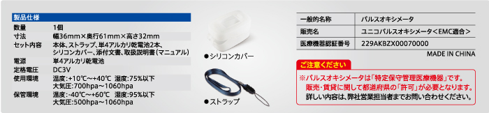 ユニコ パルスオキシメーター 50D1 返品不可 商品番号:07031206 入数:1個(本体+シリコンカバー+ストラップ) メーカー/販売代理店:日進医療器 出荷予定:3~5日後 許可分類: 許可番号:229AKBZX00070000 参考価格 ¥13,200(税込) 売価:¥9,460 (税別¥8,600) :86ポイント :カタログ有り 有資格者 選択してください はい 「有資格者」とは、鍼灸師、医師のことです 数量: 個 商品詳細説明在宅看護や高齢者家族の体調管理に。 1ボタンタイプで操作が簡単。 明るく見やすい有機ELディスプレイ採用。 4画面切り替え表示。 省電力仕様。 オートパワーオフのエコ設計。 耐衝撃性に優れたシリコンカバー、携帯に便利なストラップ付。 使用上の注意 体重100kg以上の方は正しく測定できない場合があります。 小児の場合、体重15Kg以上であれば測定可能です。 指が細い場合、親指での測定でも可能です。 使用方法 【測定条件について】 以下のような測定条件の場合、正常に測定できないことがあります。 機器を正しい位置に装着していない ・指を振るなどして測定部が安定していない 測定部に圧力がかかるなどして血流状態が不安定になっている 指先が冷えているなどして、抹消の血流が充分にない 誤差を生じるような環境条件(強い光がある/強い電磁波がある、マニキュアをしているなど) ご注意(免責)>必ずお読みください 本機器を使用するにあたり、特に末梢循環障害の患者様の場合は同じ指に2時間以上連続使用をしないでください。 使用する患者様によっては慎重に装着してください。 浮腫のある場所や柔らかい部分に挟まないでください。 本機器より放出する光は目に有害となりますので、光を凝視しないでください。 本機器は患者様診断において、付加的に使用されるものです。 測定結果は臨床状態や症状を観察しながら総合的に判断してください。 この商品を見た人は、このような商品も購入しています Kii EMS Pad Mサイズ(粘着パッド) 商品コード:08112303 定価:1,760円(税込)売価:836円(税込) 詳細を見る Kii EMS Pad Lサイズ(粘着パッド) 商品コード:08112304 定価:1,980円(税込)売価:1,078円(税込) 詳細を見る 3M レッドダット心電図検査用電極 2330(導電性粘着剤つき) 商品コード:08108006 オープン価格まとめ買い価格売価:3,025円(税込) 詳細を見る 3M レッドダット心電図検査用電極 2360(導電性粘着剤つき) 商品コード:08108011 オープン価格売価:1,188円(税込) 詳細を見る スリーエイトPAD S(4枚入) 商品コード:08101008 定価:1,100円(税込)売価:990円(税込) 詳細を見る