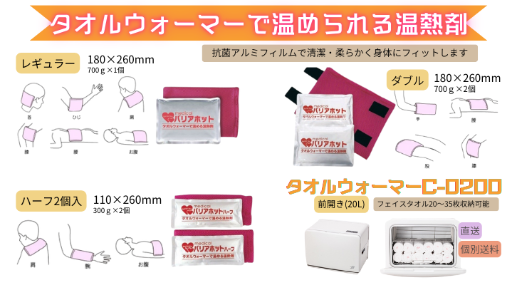 三重化学工業 バリアホット レギュラー 返品不可 商品番号:06000100 入数:1個 メーカー/販売代理店: 出荷予定:商品入荷後 許可分類: 許可番号: 参考価格 ¥2,200(税込) 売価:¥1,760 (税別¥1,600) まとめ買い価格 3個以上で1個あたり¥1,672円(税込)(税別¥1,520円) :16ポイント 数量: 個 商品詳細説明 タオルウォーマーで温められる温熱剤タオルウォーマー 安全・簡単・低コストです。抗菌アルミフィルムで清潔。柔らかく身体にフィットします。 レギュラーサイズ: 大きいサイズなので広い面を温めるのに向いています。専用カバー付きです。 保温時間の目安:4~5時間 使用する環境や方法で保温時間は変わります。 電子レンジや湯煎等はご使用できません。 商品サイズ 180×260mm 重量 700g 使用方法 タオルウォーマーが温まったらバリアホットを庫内に入れ3~4時間ほど温めてください。タオルウォーマーの性能や、バリアホットの数量によって適温までの加熱時間は変化しますので、温かさを確認しながら加熱してください。 加熱したバリアホットをやけどをしないように注意をしながら取り出し、付属のカバーに入れて使用ください。 使用後は、本品が十分に冷えてから冷暗所に保管してください。 商品について 写真のイメージと実物とは色、模様など多少異なる場合がございます。 入荷時期により、商品の仕様(デザイン、サイズ、カラー、素材、表記など)が変更する場合があります。 商品により仕様(デザイン、サイズ、カラーなど)に多少のバラツキがある場合がございます。 返品/交換について 不良品、欠品につきましては商品到着後、1週間以内にご連絡ください。 お客様のご都合による返品、交換はできません。 関連商品 ホットメイトL タオルウォーマー C-0200 (前開き) 20L タオルウォーマー(Lサイズ)18L (横・前開) この商品を見た人は、このような商品も購入しています ガラスカッピング 吸着具8号G 商品コード:08008031 定価:8,360円(税込)まとめ買い価格売価:7,942円(税込) 詳細を見る CIANA シリコーンカッピング M (4個入) 商品コード:08007202 定価:5,940円(税込)売価:5,049円(税込) 詳細を見る ソルボ D-横軸アーチパッド M(10個入) 商品コード:06073056 定価:1,540円(税込)売価:1,474円(税込) 詳細を見る