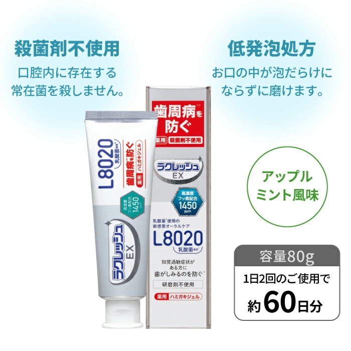 ラクレッシュEX 薬用歯磨きジェル L8020 返品不可 商品番号:14003233 入数:1個(80g) メーカー/販売代理店:ジェクス株式会社 出荷予定:商品入荷後 許可分類: 許可番号: 参考価格 ¥990(税込) 売価:¥682 (税別¥620) :7ポイント 数量: 個 商品詳細説明9月入荷予定 L8020乳酸菌を使用した薬用ハミガキジェル 薬用成分が、歯ぐきの炎症をしっかり抑えて歯周病※2を防ぐ 硝酸カリウムが、歯がしみるのを防ぐ(高濃度フッ素1450ppmを配合) L8020乳酸菌※使用 医薬部外品 歯周病※2を防ぐ 高濃度フッ素配合1450ppm 殺菌剤不使用 研磨剤不使用 低発泡処方 アップルミント風味:80g ※ラムノーザス乳酸菌/コメ発酵末(矯味剤) ※2歯周病とは(歯肉炎・歯周炎)の総称です。 外装サイズ 幅43×奥35×高160(mm) 容量 80g 重量 104g 必要表記事項 《効能・効果》 歯がしみるのを防ぐ、歯肉(齦)炎の予防、歯周炎(歯槽膿漏)の予防、むし歯の発生及び進行の予防、歯石の沈着を防ぐ、タバコのやに除去、歯を白くする、口臭の防止、口中を浄化する、口中を爽快にする。 《成分》 溶剤:精製水、潤滑剤:濃グリセリン、ソルビット液、粘度調整剤:無水ケイ酸、有効成分:硝酸カリウム、フッ化ナトリウム(フッ素)、ポリリン酸ナトリウム、グリチルリチン酸ジカリウム、甘味剤:キシリトール、サッカリンナトリウム、ステビアエキス、矯味剤:ラムノーザス乳酸菌/コメ発酵末、粘結剤:キサンタンガム、発泡剤:ヤシ油脂肪酸アミドプロピルベタイン液、可溶剤:ポリオキシエチレン硬化ヒマシ油、pH調整剤:クエン酸ナトリウム、リン酸水素二ナトリウム、香味剤:香料(アップルミントタイプ)、清涼剤:l-メントール、保存剤:パラベン、着色剤:青色1号、黄色4号 《ご使用方法》 適量(1cm)を歯ブラシにとり、歯及び歯ぐきをブラッシングしてください。 《ご使用上の注意》 1.発疹・発赤、かゆみ等の異常が現れた場合には使用を中止し、医師、歯科医師又は薬剤師に相談してください。 2.口内に傷がある場合には使用を控えてください。 3.目に入ったら、こすらずすぐに充分洗い流し、異常が残る場合には眼科医に相談してください。 4.(1)6歳未満の子供への使用は控えてください。(2)6歳未満の子供の手の届かない所に保管してください。 製造販売元 日本ゼトック株式会社 販売元 ジェクス株式会社 ブランド:JEX 商品名:L8020乳酸菌使用 ラクレッシュEX 薬用ハミガキジェル 医薬部外品 高濃度フッ素配合 アップルミント風味 80g JAN4973210995700 この商品を見た人は、このような商品も購入しています CIANA シリコーンカッピング M (4個入) 商品コード:08007202 定価:5,940円(税込)売価:5,049円(税込) 詳細を見る ガラスカッピング 吸着具8号G 商品コード:08008031 定価:8,360円(税込)まとめ買い価格売価:7,942円(税込) 詳細を見る ソルボ D-横軸アーチパッド M(10個入) 商品コード:06073056 定価:1,540円(税込)売価:1,474円(税込) 詳細を見る