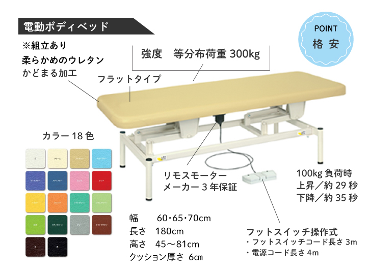 電動ベッド 電動ボディベッド 返品不可 商品番号:09106025 入数:1台 メーカー/販売代理店:タカダベッド 出荷予定:商品入荷後 許可分類: 許可番号: 参考価格 ¥184,250(税込) 売価:¥124,850 (税別¥113,500) :0ポイント 横幅の選択 選択してください 60cm 65cm 70cm 長さの選択 選択してください 180cm オリジナルレザー18色 選択してください 白 クリーム アイボリー スカイブルー ライトブルー メディブルー ピンク レッド イエロー オレンジ ライトグリーン ライムグリーン 抹茶 メディグリーン グレー ライトブラウン 茶 黒 規格 選択してください 有孔 無孔 数量: 台 商品詳細説明人気の電動ボディベッド 昇降シリーズ史上初の脚部現地組立式を採用し梱包をコンパクト化 柔らかめのウレタンとかどまる加工シートで心地よい院内環境を演出 脚部フレームを内側に加工して頭部側・足側からの施術効率をアップ ※画像は無孔タイプ 長さ 180 (cm) 幅 60/65/70 (cm) 高さ 45~81 (cm) クッション厚 6cm 重量 約50kg 強度レベル (メーカー指標5段階) 等分布荷重300Kg 組立の有無 組立必要(スパナ付属) 配送につきまして 大型商品(大型宅配便)について お届けは玄関の前まで、ビルやマンションの場合は共同玄関口までの配達となります。配達員は1名でお伺いをいたしますので、トラックからの荷下ろし、 搬入が困難な場合、お客様にお手伝いをお願いしております。 再配達について 路線便での配送となるため、不在時の持ち帰りや再配達の際に別途費用が発生します。ご不明な点はお問い合わせください。 搬入・設置組立について 時間指定や階段を利用しての搬入、設置組立をご希望の場合も別途費用が発生します。必要な場合は予めご相談ください。 個人宅への配送について ご注文時の備考欄に(施設名・屋号・予定名称)をご記入ください。お届け先が個人様宛の場合、別途送料が必要です。 北海道・沖縄・離島へのお届けについて 追加送料が発生します。法人様につきましても追加送料分のご負担が必要です。お問合せ下さい。 メーカより直送のため「代引」「ヤマト運輸指定」不可 還元値引き実施中! こちらの商品は還元お値引き対象製品です。 例)商品代金100,000円×▲3%(銀行振込)=97,000円【3,000円のお値引き】 納期につきまして 受注生産の為、ご決済後のお手配になります。通常1週間前後でお届けできます。 メーカーの配送状況により遅れる場合もございます。予め、ご了承ください。 納期確定次第、メールまたはお電話にてご連絡をさせていただきます。 この商品を見た人は、このような商品も購入しています さらさプロテクションテープ 商品コード:06272401 定価:3,014円(税込)まとめ買い価格売価:2,305円(税込) 詳細を見る 富士商 ホット&スチームパッド 首・肩用 商品コード:06229307 定価:4,950円(税込)まとめ買い価格売価:2,821円(税込) 詳細を見る 綿花 4cm×4cm 500g 商品コード:06030002 定価:1,650円(税込)売価:1,045円(税込) 詳細を見る やわらかペーパー スリッパ DX ホワイト 25組 50枚入り 商品コード:17001021 定価:4,620円(税込)売価:3,168円(税込) 詳細を見る ディスポカバーTP 500枚 商品コード:09030101 オープン価格売価:3,355円(税込) 詳細を見る