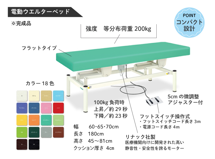 電動ベッド 【らくらく配送付き】ウェルター 返品不可 商品番号:090106026 入数:1台 メーカー/販売代理店:タカダベッド 出荷予定:商品入荷後 許可分類: 許可番号: 参考価格 ¥220,000(税込) 売価:¥153,450 (税別¥139,500) :0ポイント 横幅の選択 選択してください 60cm 65cm 70cm 長さの選択 選択してください 180cm オリジナルレザー18色 選択してください 白 クリーム アイボリー スカイブルー ライトブルー メディブルー ピンク レッド イエロー オレンジ ライトグリーン ライムグリーン 抹茶 メディグリーン グレー ライトブラウン 茶 黒 規格 選択してください 無孔 有孔 数量: 台 商品詳細説明コンパクト設計 実用性の高い旋回昇降式を採用したコンパクト設計ミディアムモデル 信頼性と静音性が高い廉価版専用モーターを採用。フットスイッチ式 床面との隙間を微調整できる直径5cmの便利なアジャスター付き 完成品 ※画像は無孔タイプ 長さ 180 (cm) 幅 60/65/70 (cm) 高さ 45~83 (cm) クッション厚 4cm 重量 約50kg 強度(5段階) 強度2 強度レベル (メーカー指標5段階) 等分布荷重200Kg 強度2 らくらく設置便のご案内 配送による、お客様のご負担をできる限り軽減します。 再配達について 路線便での配送となるため、不在時の持ち帰りや再配達の際に別途費用が発生します。ご不明な点はお問い合わせください。 法人への配送になります ご注文時の備考欄に(施設名・屋号・予定名称)をご記入ください。 ※離島の場合、別途送料が加算されます。料金につきましてはお問合せください。 メーカより直送のため「代引」「ヤマト運輸指定」不可 還元値引き実施中! こちらの商品は還元お値引き対象製品です。 例)商品代金100,000円×▲3%(銀行振込)=97,000円【3,000円のお値引き】 納期につきまして 受注生産の為、ご決済後のお手配になります。通常1週間前後でお届けできます。 メーカーの配送状況により遅れる場合もございます。予め、ご了承ください。 納期確定次第、メールまたはお電話にてご連絡をさせていただきます。 この商品を見た人は、このような商品も購入しています 富士商 ホット&スチームパッド 首・肩用 商品コード:06229307 定価:4,950円(税込)まとめ買い価格売価:2,821円(税込) 詳細を見る ディスポカバーTP 500枚 商品コード:09030101 オープン価格売価:3,355円(税込) 詳細を見る 綿花 4cm×4cm 500g 商品コード:06030002 定価:1,650円(税込)売価:1,045円(税込) 詳細を見る テイコクファルマ ファルマテックス緑 商品コード:06289020 オープン価格まとめ買い価格売価:2,365円(税込) 詳細を見る さらさテープ 商品コード:06272001 定価:2,486円(税込)まとめ買い価格売価:1,930円(税込) 詳細を見る