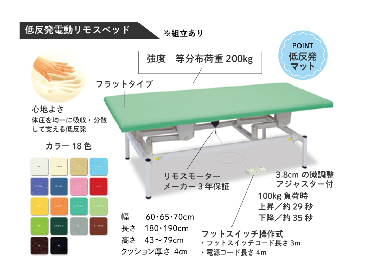 電動ベッド 低反発リモス 返品不可 商品番号:09106031 入数:1台 メーカー/販売代理店:タカダベッド 出荷予定:商品入荷後 許可分類: 許可番号: 参考価格 ¥223,300(税込) 売価:¥133,980 (税別¥121,800) :0ポイント 横幅の選択 選択してください 60cm 65cm 70cm 長さの選択 選択してください 180cm 190cm オリジナルレザー18色 選択してください ①白 ②クリーム ③アイボリー ④スカイブルー ⑤ライトブルー ⑥メディブルー ⑦ピンク ⑧レッド ⑨イエロー ⑩オレンジ ⑪ライトグリーン ⑫ライムグリーン ⑬抹茶 ⑭メディグリーン ⑮グレー ⑯ライトブラウン ⑰茶 ⑱黒 規格 選択してください 無孔 有孔 数量: 台 商品詳細説明体位分散性のすぐれた低反発ウレタンを採用 リモスモーター採用のコストパフォーマンスに優れた電動昇降ベッド 体圧分散性と衝撃吸収性に優れている低反発ウレタンフォームを採用 床面との隙間を微調整できる直径3.8cmの便利なアジャスター付き ※低反発ウレタンは低温環境では固くなる特性があるのでご注意ください ※画像は無孔タイプ 長さ 180 /190(cm) 幅 60/65/70 (cm) 高さ 43~79 (cm) クッション厚 4cm 重量 約49kg 強度レベル (メーカー指標5段階) 等分布荷重200Kg 組立の有無 組立必要(スパナ付属) 配送につきまして 大型商品(大型宅配便)について お届けは玄関の前まで、ビルやマンションの場合は共同玄関口までの配達となります。配達員は1名でお伺いをいたしますので、トラックからの荷下ろし、 搬入が困難な場合、お客様にお手伝いをお願いしております。 再配達について 路線便での配送となるため、不在時の持ち帰りや再配達の際に別途費用が発生します。ご不明な点はお問い合わせください。 搬入・設置組立について 時間指定や階段を利用しての搬入、設置組立をご希望の場合も別途費用が発生します。必要な場合は予めご相談ください。 個人宅への配送について ご注文時の備考欄に(施設名・屋号・予定名称)をご記入ください。お届け先が個人様宛の場合、別途送料が必要です。 北海道・沖縄・離島へのお届けについて 追加送料が発生します。法人様につきましても追加送料分のご負担が必要です。お問合せ下さい。 メーカより直送のため「代引」「ヤマト運輸指定」不可 還元値引き実施中! こちらの商品は還元お値引き対象製品です。 例)商品代金100,000円×▲3%(銀行振込)=97,000円【3,000円のお値引き】 納期につきまして 受注生産の為、ご決済後のお手配になります。通常1週間前後でお届けできます。 メーカーの配送状況により遅れる場合もございます。予め、ご了承ください。 納期確定次第、メールまたはお電話にてご連絡をさせていただきます。 この商品を見た人は、このような商品も購入しています さらさプロテクションテープ 商品コード:06272401 定価:3,014円(税込)まとめ買い価格売価:2,305円(税込) 詳細を見る 富士商 ホット&スチームパッド 首・肩用 商品コード:06229307 定価:4,950円(税込)まとめ買い価格売価:2,821円(税込) 詳細を見る 綿花 4cm×4cm 500g 商品コード:06030002 定価:1,650円(税込)売価:1,045円(税込) 詳細を見る やわらかペーパー スリッパ DX ホワイト 25組 50枚入り 商品コード:17001021 定価:4,620円(税込)売価:3,168円(税込) 詳細を見る ディスポカバーTP 500枚 商品コード:09030101 オープン価格売価:3,355円(税込) 詳細を見る