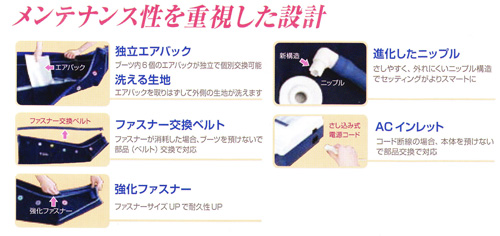 フィジカルメドマー PM-8000 返品不可 商品番号:14015201 入数:本体+ブーツ(両脚またはパンツタイプ)+ホース メーカー/販売代理店:メドー産業 出荷予定:商品入荷後 許可分類: 許可番号:221AHBZX00013000 オープン価格 お見積もり価格となります : 商品詳細説明初登場!洗えるカフ!衛生的で臭わない! 洗えるカフやACインレット、ファスナー交換ベルトの採用でメンテナンス性にすぐれた新製品です。 本体1台で様々なカフタイプに対応 ソフトな空気の力で足先から太腿まで揉みほぐすマッサージ器です。空気室の加圧・除圧を繰り返すことにより、筋肉の収縮・弛緩と同じ作用で血液やリンパ液の循環をより効果的に促進します。疲労回復や血行促進、筋肉の疲れをとる効果があり、医療現場のリハビリ目的にも使用できます。 特徴 ブーツ、パンツを1台で操作 メンテナンス性を重視した設計 洗える生地 独立したエアバック(個別交換可能) さしやすく外れにくいニップル構造 強化ファスナー及び交換ベルト採用で修理の手間を軽減 最低圧力15mmHgで、デリケートな患者様にも対応 ACインレットの採用で修理の手間を軽減 独立エアバック ブーツ内6個のエアバックが独立で個別交換可能 洗える生地 エアバックを取り外して外側の生地が洗えます ファスナー交換ベルト ファスナーが消耗した場合、ブーツを預けないで部品(ベルト)交換で対応 強化ファスナー ファスナーサイズUPで耐久性UP 進化したニップル さしやすく、外れにくいニップル構造でセッティングがよりスマートに ACインレット コード断線の場合、本体を預けないで部品交換で対応 あんま、マッサージの代用 血行促進 疲労回復 筋肉の疲れをとる 筋肉のコリをほぐす 神経痛、筋肉痛の緩解 仕様 電源:AC100V /消費電力:48/46(PSE) 38/35W(JIS) もみ上げサイクル:ウェーブモード 60秒、スクイーズモード 50秒、ハイパーモード 30秒 タイマー設定時間:1~30分 /空気圧力調節範囲:2~12kPa(15~90mmHg) /定格時間:30分 パンツタイプあります 保証期間1年 ご家庭でもご使用いただけます ご使用前に必ず取扱説明書をお読みになり、安全にご使用ください ご使用上の注意 メドマーを使用する場合、以下の点に注意してください。 【警告】 次の人は本機の使用を禁止します。 1.発症後6ヶ月以内の下肢深部静脈血栓症を患っているか、もしくはその恐れのある場合。 *「下肢深部静脈血栓症」とは、下肢全体または膝より下が腫れ上がって痛みがあり、立ったり歩いたりすると痛みが強くなる自覚症状のあることをいいます。 2.装着部におでき、やけど、虫さされなどの急性炎症や化膿性疾患がある場合。 3.医師が使用を不適当と認めた場合。 【注意】 次の人は必ず医師と相談の上使用してください。症状や病因によっては使用に適さない場合があります。 1.心臓に障害のある人 2.糖尿病の人 3.骨粗しょう症の人 4.装着部に疾患から生じるむくみや疼痛のある人 5.装着部に骨折、脱臼、肉離れ、捻挫、外傷のある人 6.悪性腫瘍のある人 7.高血圧症と診断されている人 8.妊娠している人 9.安静を必要とする人 10.特に身体に異常を感じている人 11.熱の高い人 12.皮膚の弱い人 13.上記以外の疾患で医師の治療を受けている人 14.自覚症状の意思表示ができない人 15.本機の使用によりかえって疼痛の増す人 16.本機を使用しても症状の改善が見られない人 ★通常、圧力設定は「3」以下でご使用下さい。特にお肌の弱い方は圧迫痕が残ることがあります。 この商品を見た人は、このような商品も購入しています CIANA シリコーンカッピング M (4個入) 商品コード:08007202 定価:5,940円(税込)売価:5,049円(税込) 詳細を見る ガラスカッピング 吸着具8号G 商品コード:08008031 定価:8,360円(税込)まとめ買い価格売価:7,942円(税込) 詳細を見る ソルボ D-横軸アーチパッド M(10個入) 商品コード:06073056 定価:1,540円(税込)売価:1,474円(税込) 詳細を見る
