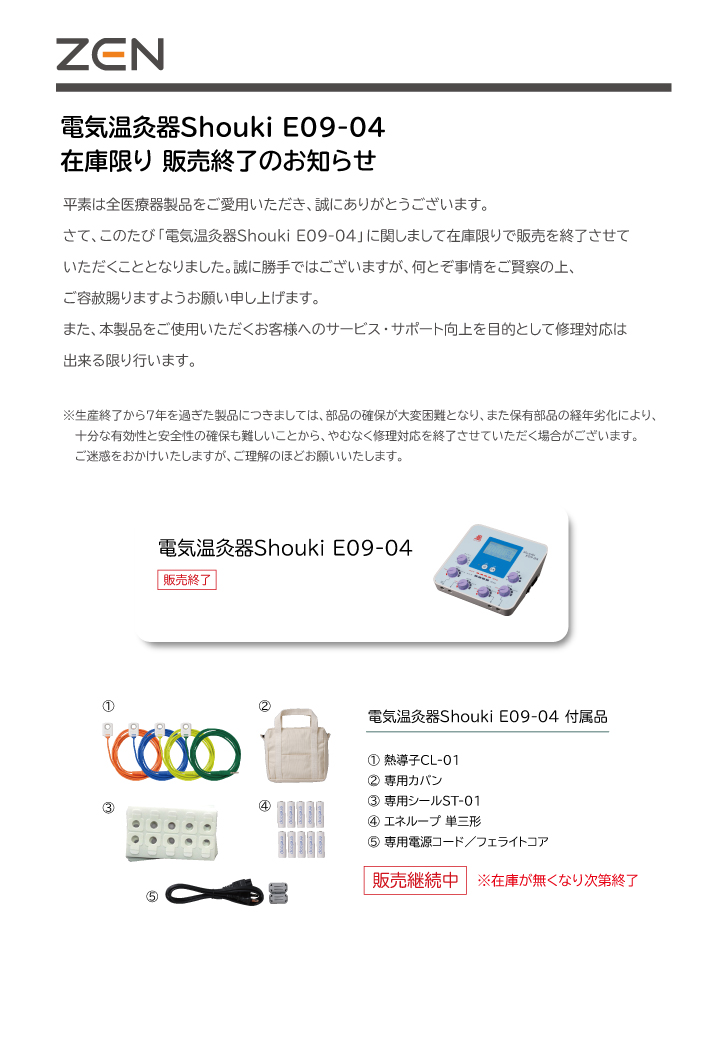 -電気温灸器Shouki E09-04 本体のみ販売終了- Shouki E09-04 専用バッグ 商品コード:08601022 定価:4,400円(税込)売価:3,142円(税込) 詳細を見る Shouki E09-04 CL-01(熱導子)1本 商品コード:08601006 定価:6,600円(税込)売価:4,730円(税込) 詳細を見る Shouki E09-04 CL-01(熱導子) 4本組 商品コード:08601005 定価:24,200円(税込)売価:16,500円(税込) 詳細を見る Shouki E09-04 専用シールST-01(10個×100シート) 1000個 商品コード:08601012 定価:9,240円(税込)売価:5,500円(税込) 詳細を見る Shouki E09-04 専用シールST-01(10個×50シート) 500個 商品コード:08601011 定価:4,620円(税込)売価:3,080円(税込) 詳細を見る Shouki E09-04 専用電源コード(フェライトコア付) 商品コード:08601007 定価:2,750円(税込)売価:1,980円(税込) 詳細を見る