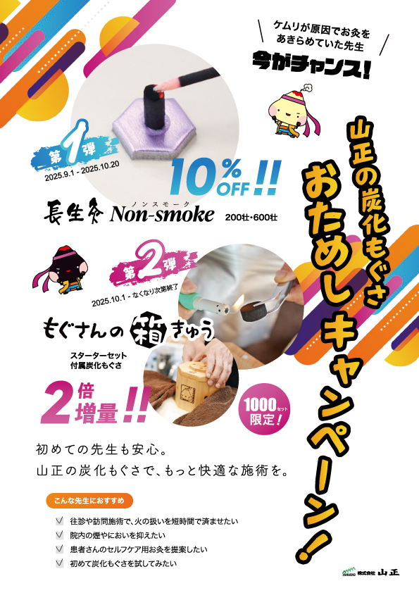 《長生灸 スモークレス もぐさんの箱灸 キャペーンのご案内》 《長生灸 スモークレス もぐさんの箱灸 キャペーンのご案内》 第一弾:10%OFFキャンペーン(スモークレスのみ対象)9/1~9/20まで 第二弾:もぐさんの箱灸キャンペーン(もぐさ増量)10/1~※無くなり次第終了