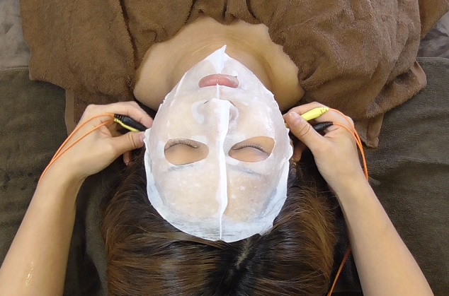 顔パックの上から電気ていしんコードでなぞるように、優しく滑らせます。