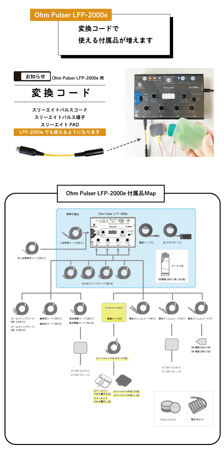 【新商品】変換コードDIN Ohm Pulser LFP-2000e用 「変換コード」新発売 「変換コード」で オームパルサーLFP-4000A・4500・4800専用の付属品 スリーエイトパルスコード スリーエイトパルス導子 S スリーエイトパルス導子 L スリーエイトPAD S スリーエイトPAD L を「Ohm Pulser LFP-2000e」でも使えるようになります。