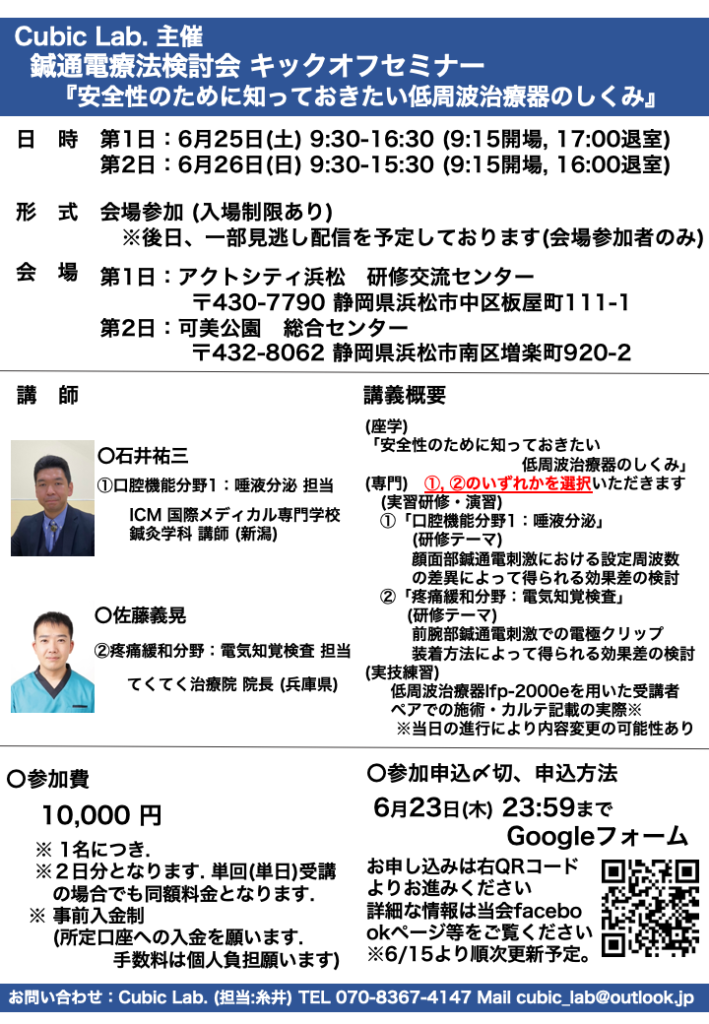 Cubic Lab.主催【鍼通電療法検討会キックオフセミナー】のご案内 2022年6月25日(土)〜26日(日) に静岡県浜松市にて実施する Cubic Lab. 主催 鍼通電療法検討会 キックオフセミナーのご案内です。 『安全性のために知っておきたい低周波治療器のしくみ』 ご参加ご希望の方はQRコード または、こちらのメールアドレスからお申し込みください。 mail:cubic_lab@outlook.jp